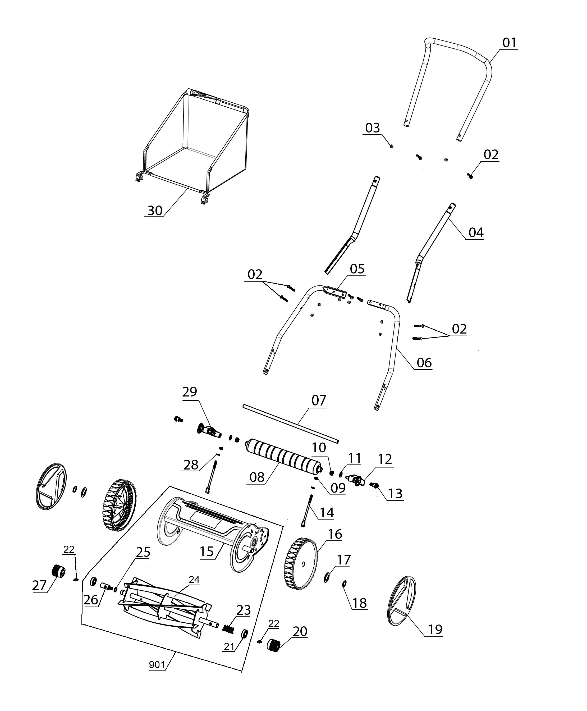 The Einhell GC-HM 300 cylinder lawn mower is a robust, functional lawn mower without a motor drive, for the clean, quiet and environment-friendly mowing of lawns of up to 150 m² in size. The ball-bearing mounted mower spindle with five high-grade steel blades is designed for a cutting width of 30 cm. The cutting height adjustment facility with 4 levels can be adjusted to individual requirements between 13 mm and 37 mm. The plastic roller has a diameter of 45 mm. The cylinder lawn mower has lawn-friendly large wheels. A curved long handle provides optimum on-the-job ergonomics, and there is a parking position for easy and secure storage of the lawn mower. The 16 liter grass catch basket is removable and easy to empty.